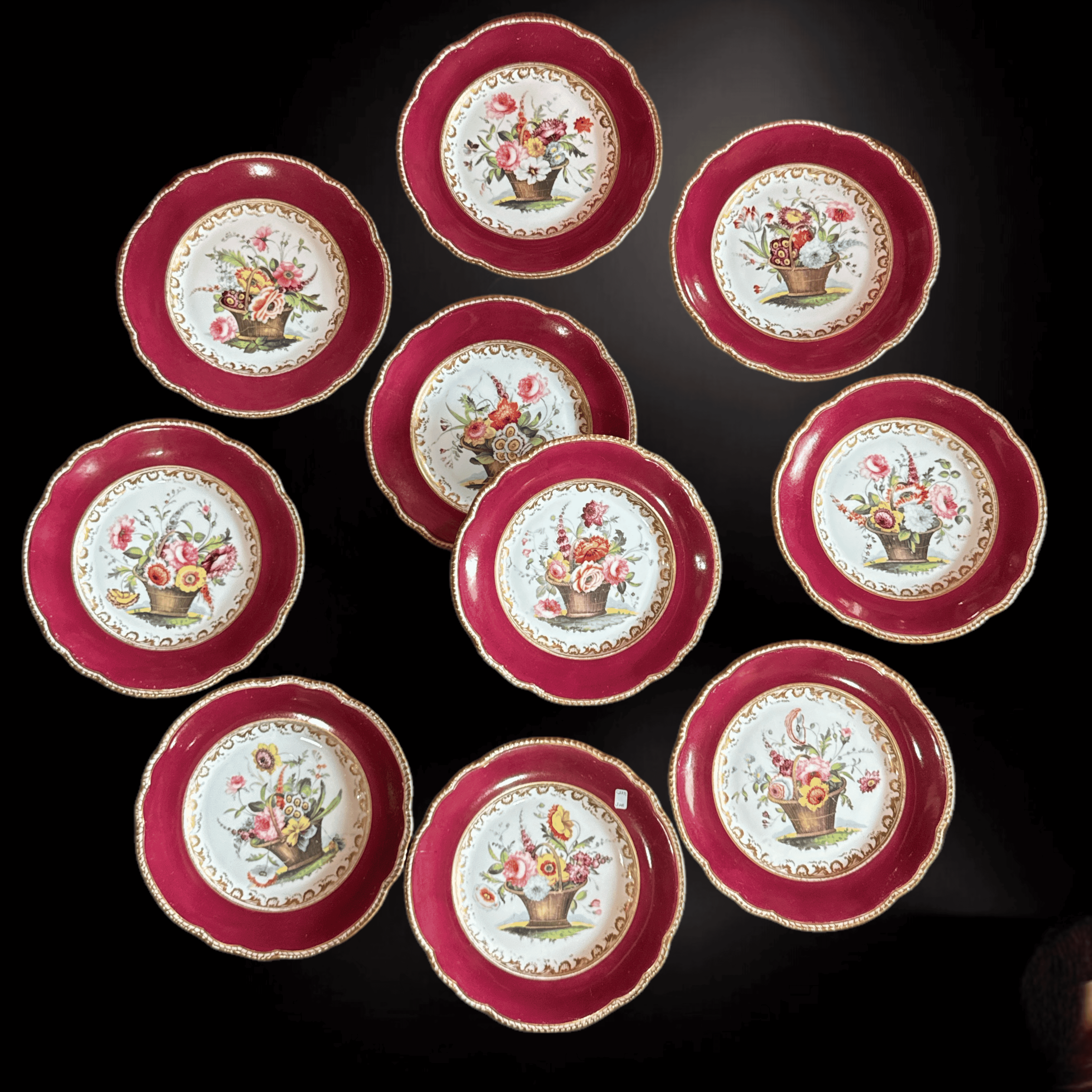 Set of 10 Samuel Alcock plates with claret border, centre handpainted with baskets of flowers, circa 1835