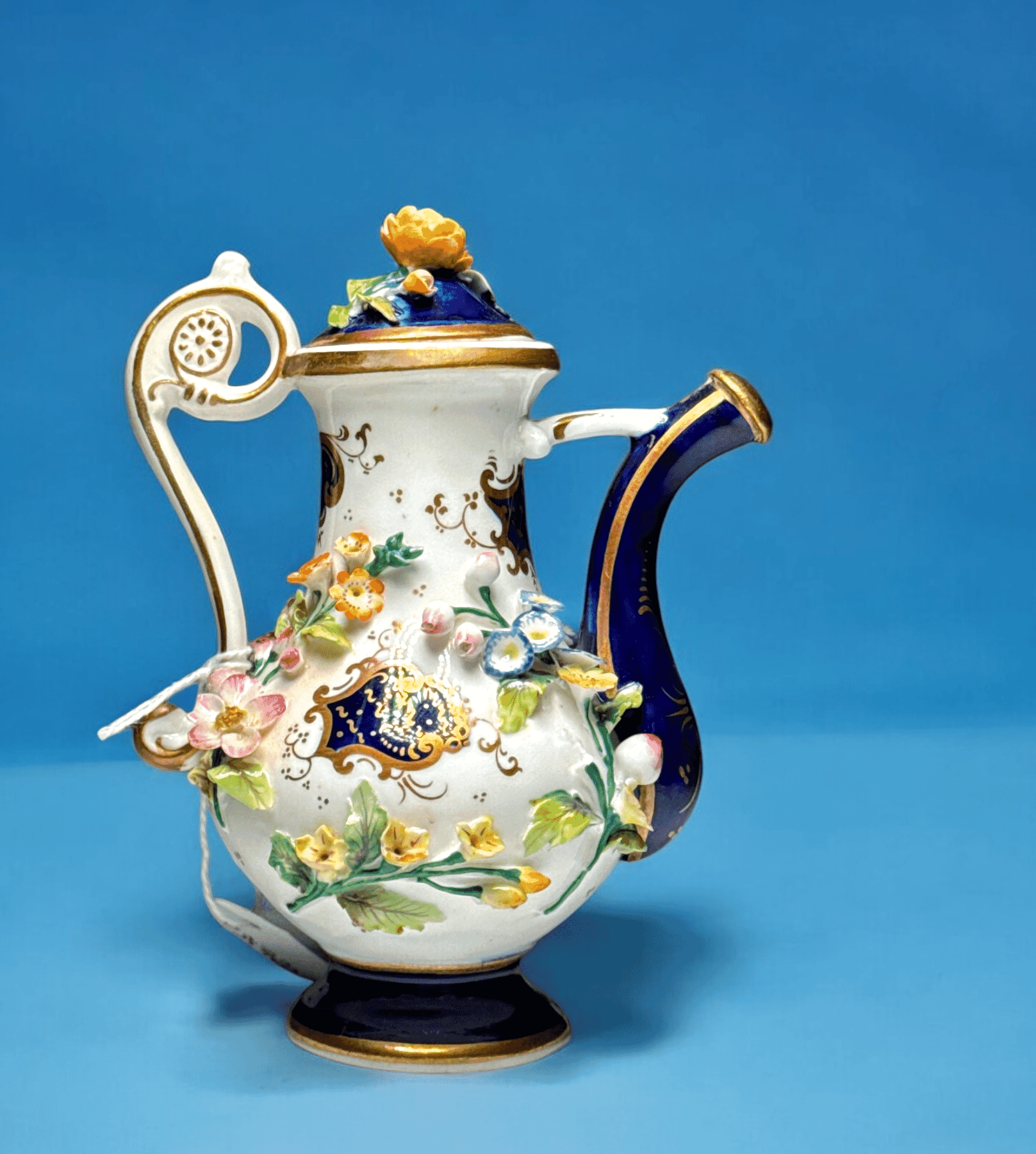 English porcelain flower-encrusted ewer / watering can / pounce pot, blue lid & spout, c. 1830