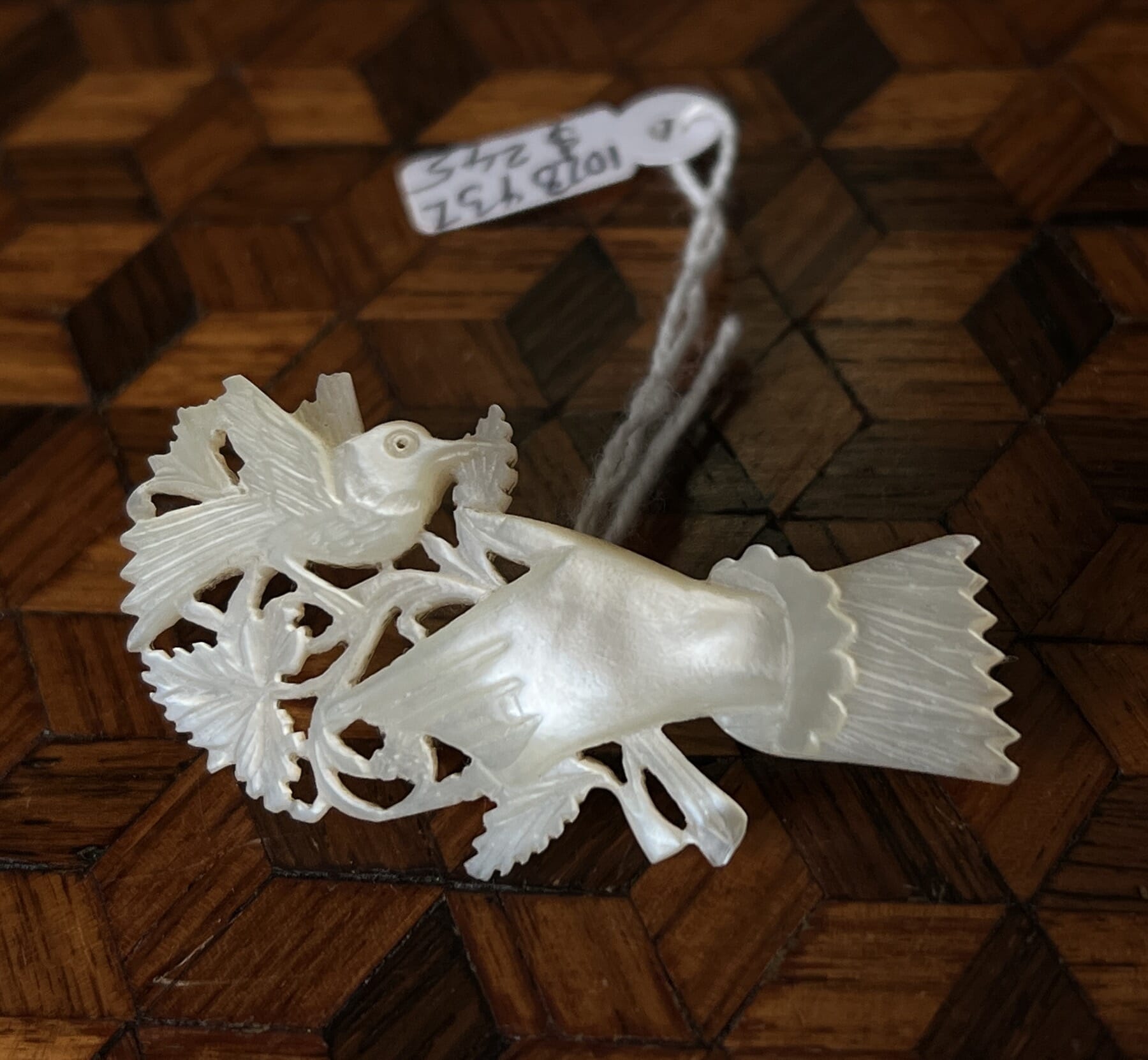 Pearlshell brooch, hand holding a bird on branch, c.1870