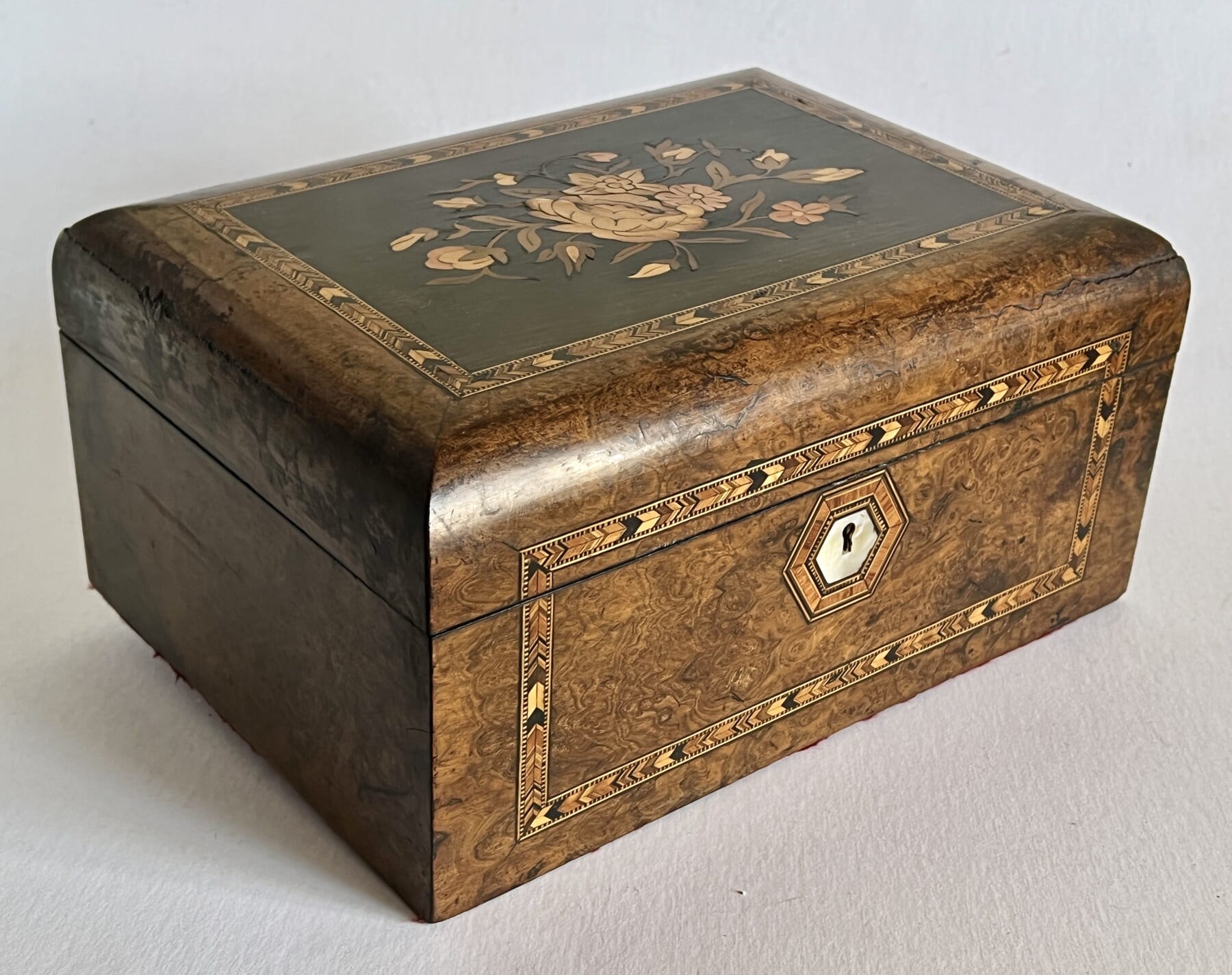 Victorian jewellery box, burr walnut with flower inlaid top, c. 1865