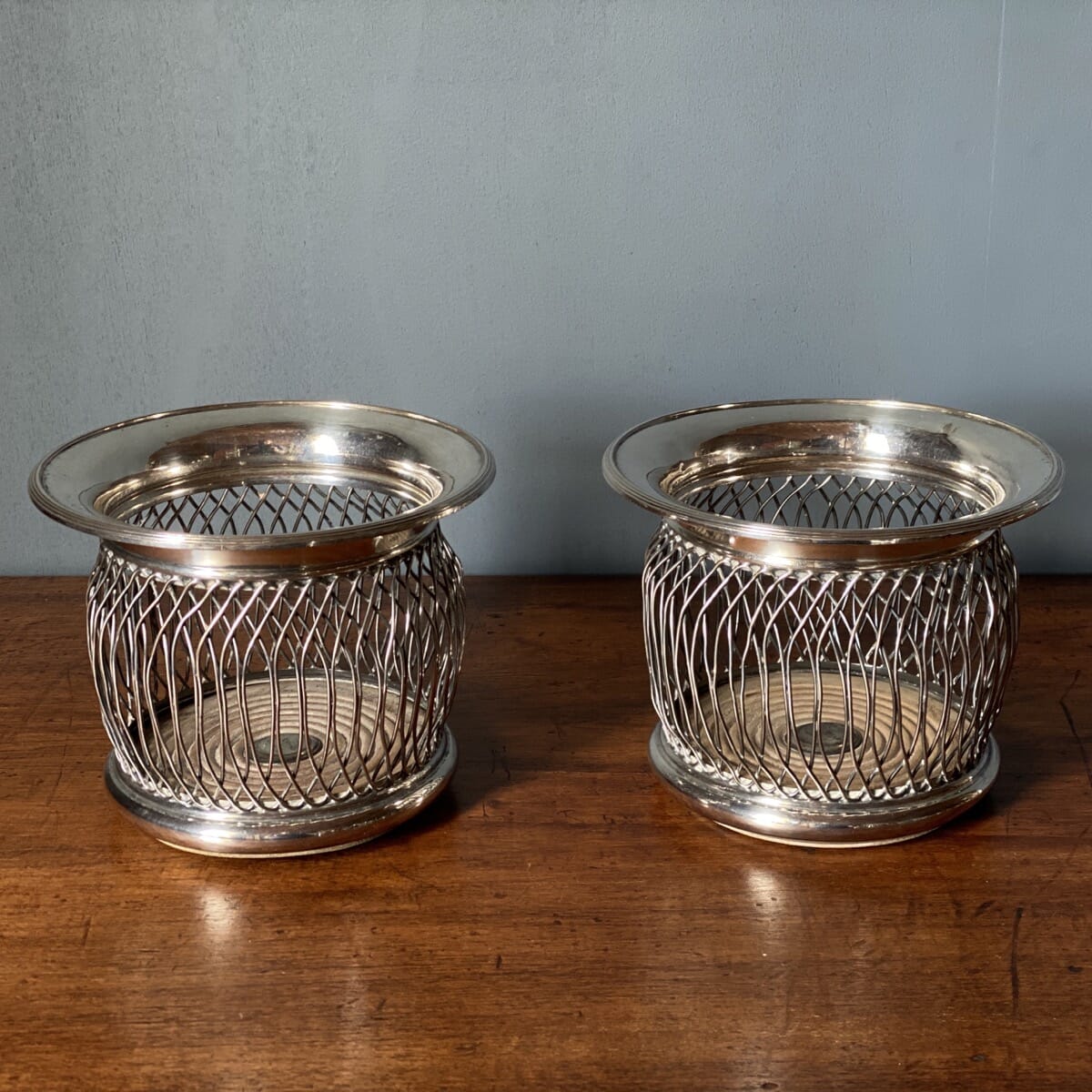Pair of tall silverplate wine bottle holders, wirework, prob. French, c. 1820