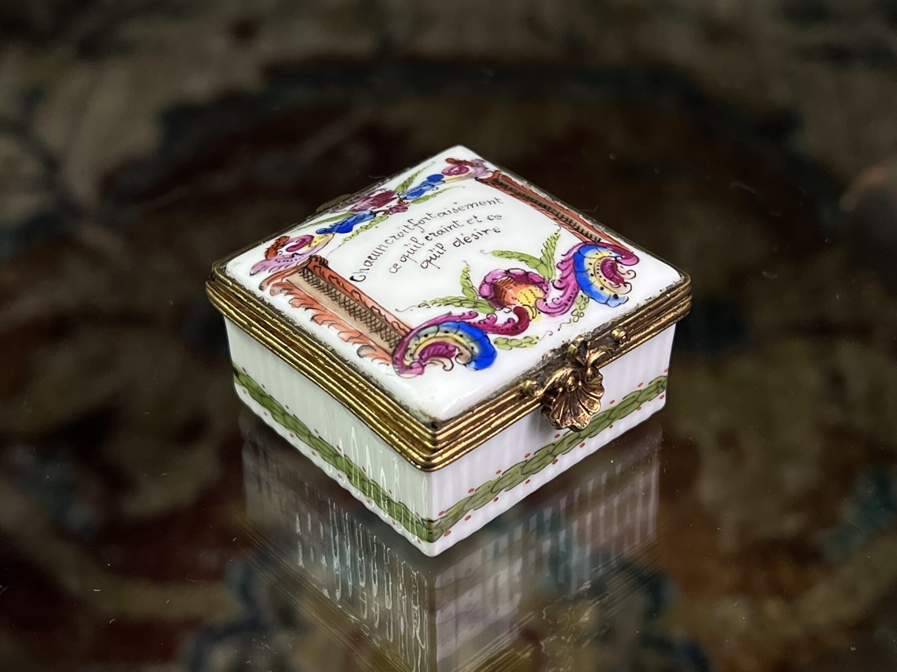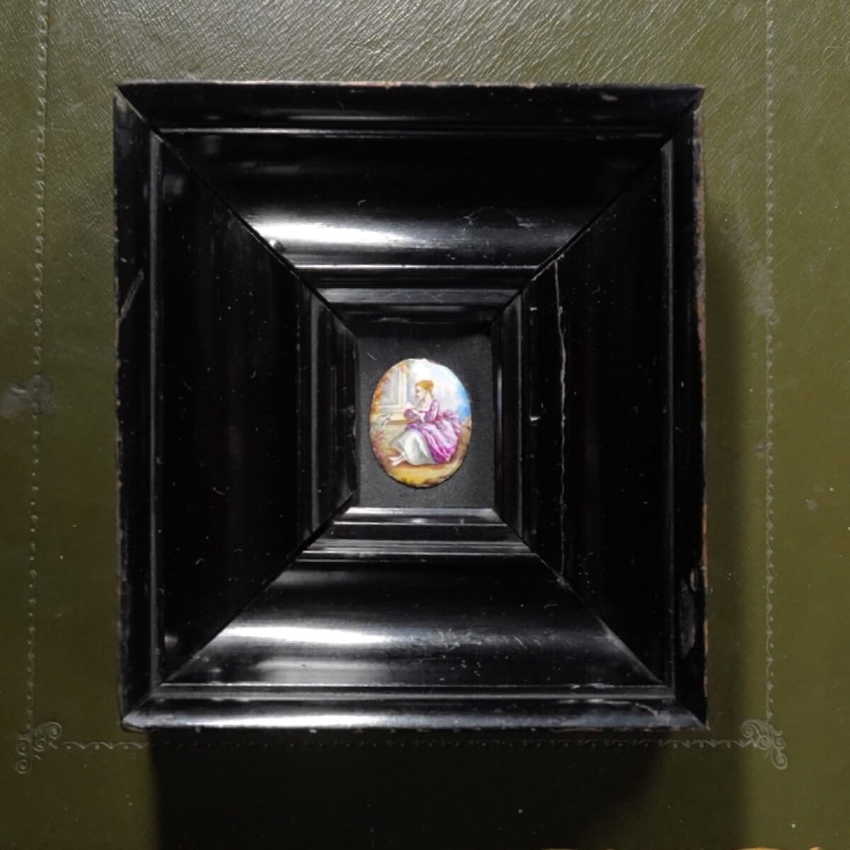 Miniature enamel plaque in black frame, Lady with dove, c.1880