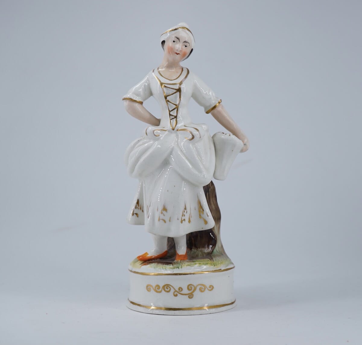 Staffordshire porcelain figure, girl with beehive & flowerbasket, c.1840