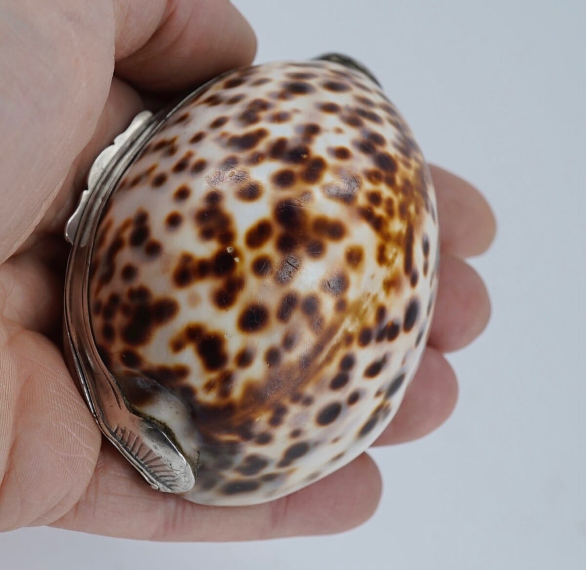 Tiger Cowrie Shell snuffbox with silver metal mounts, 19th century