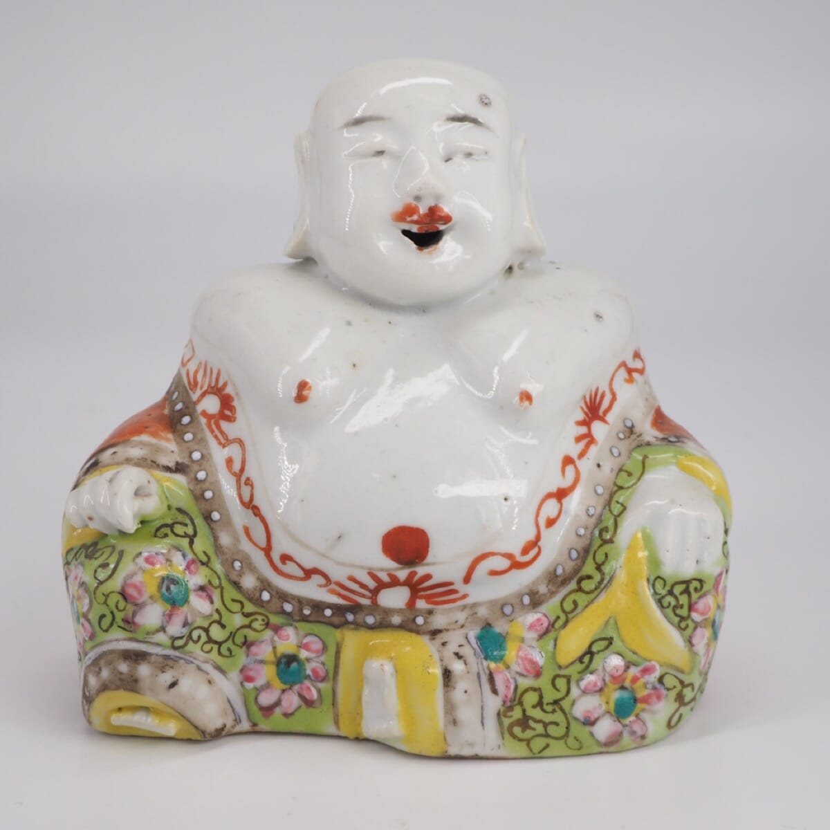 Chinese porcelain seated buddha with colourful robes, late 19c.
