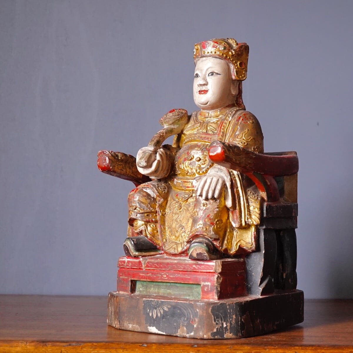 Chinese carved & painted figure of an enthroned deity, Qing Dynasty