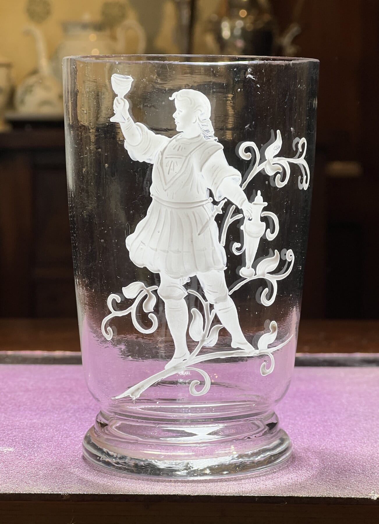 Continental glass beaker, white enamel dec. of a man with goblet, c.1860$780.00 AUD#1027011View item