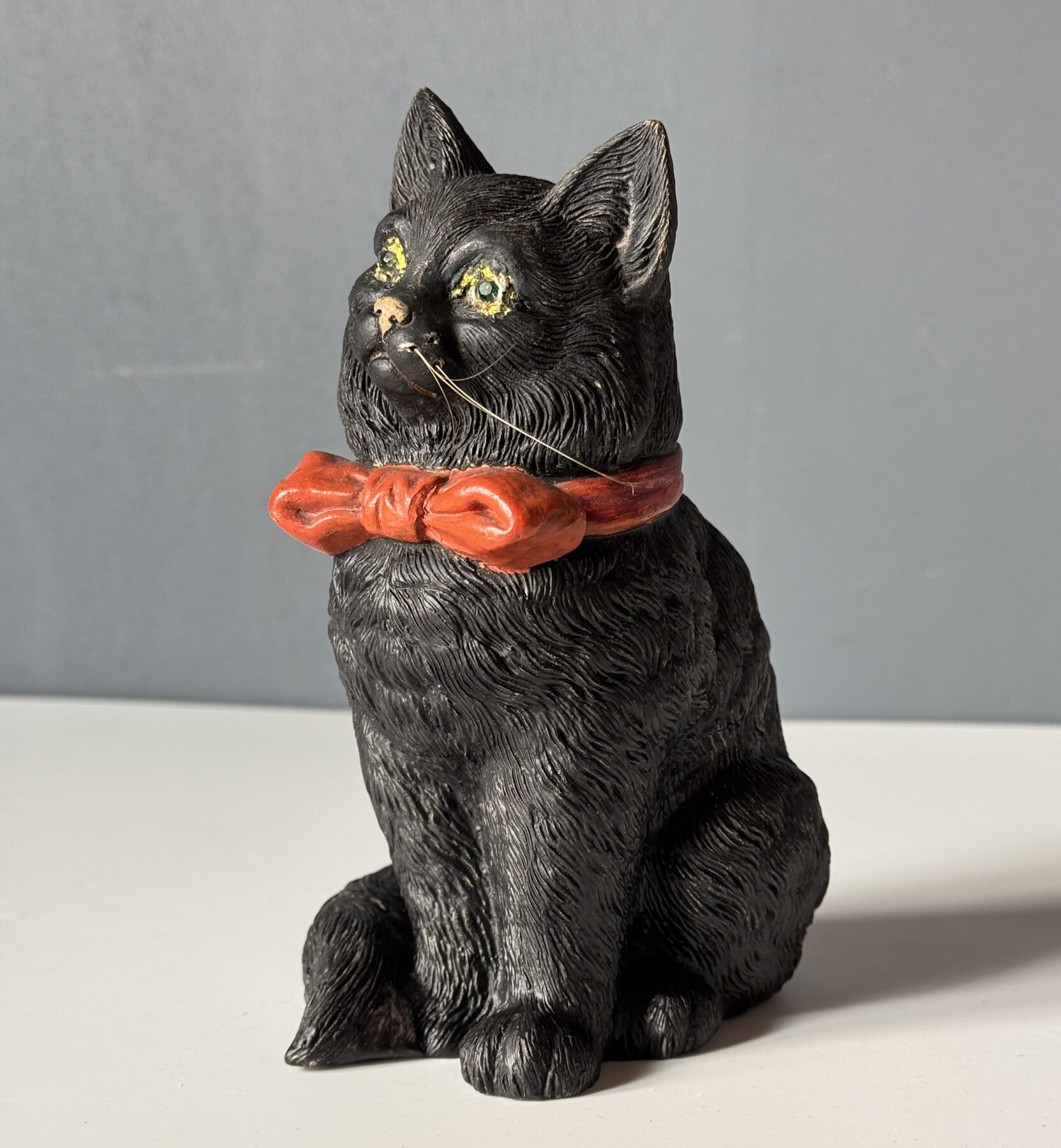 Black Cat – Austrian teracotta figure with red ribbon, green glass eyes, c. 1895